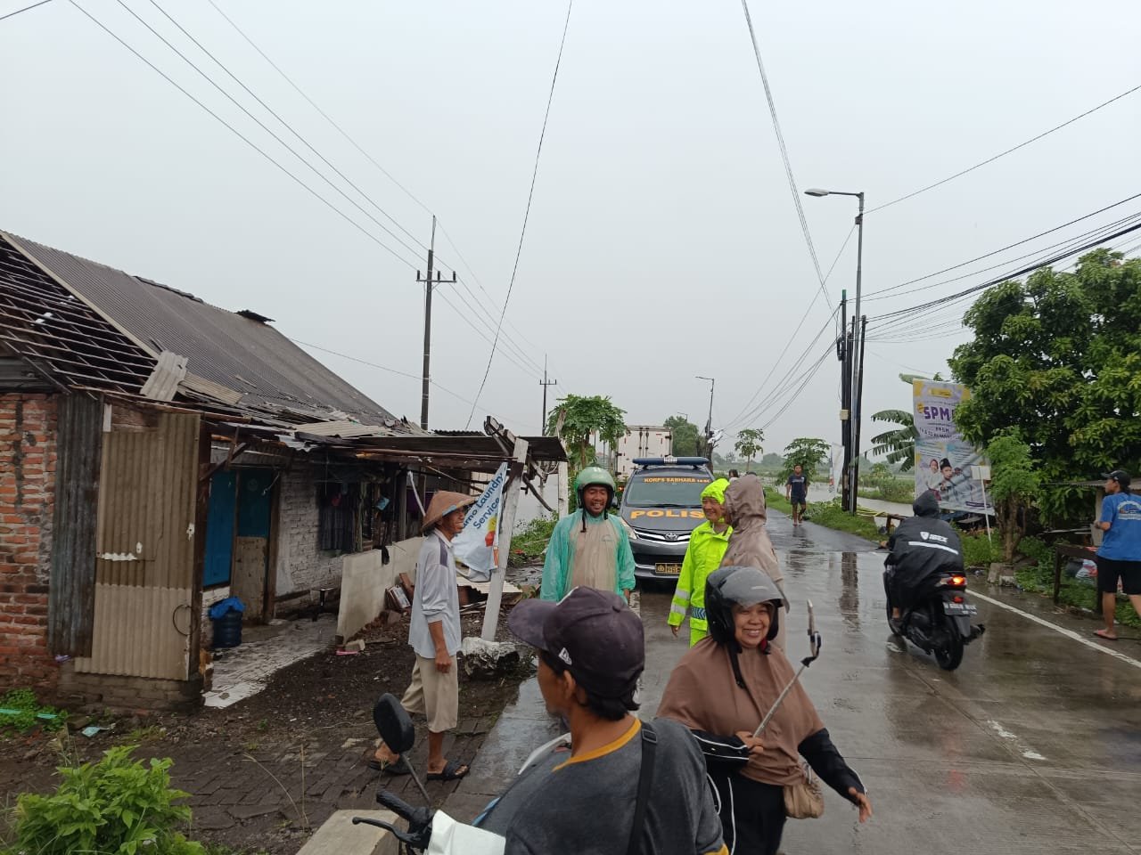 Bersama warga setempat, personel Polsek Buduran dan stake holder terkait bahu-membahu membersihkan reruntuhan atap rumah yang berhamburan di jalan maupun di pekarangan rumah warga.
