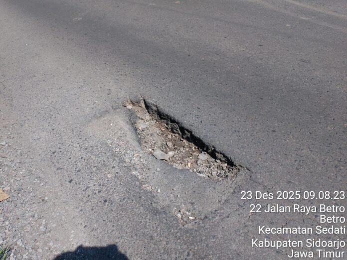 Newsils.com || Sidoarjo — Kondisi Jalan Raya Betro Km 22, Kecamatan Sedati, Kabupaten Sidoarjo, dikeluhkan para pengguna jalan. Tercatat sedikitnya 15 lubang bekas galian PDAM yang hingga kini terkesan terabaikan dan belum diperbaiki secara layak.