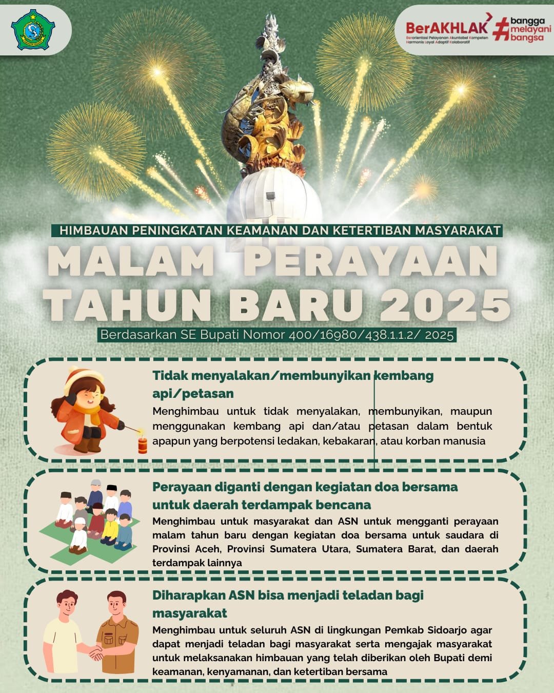 Melalui surat edaran ini, Pemerintah Kabupaten Sidoarjo berharap seluruh elemen masyarakat dapat berperan aktif dalam menciptakan suasana malam Tahun Baru 2025 yang aman, tertib, dan penuh kepedulian sosial.(Sult/Kominfo