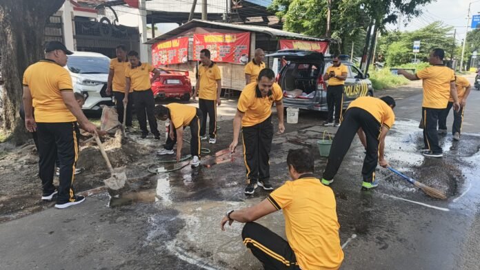 Newsils.com || Dalam rangka mencegah terjadinya kecelakaan lalu lintas, Polsek Balongbendo Polresta Sidoarjo melaksanakan kegiatan bhakti keselamatan berupa penambalan sementara jalan protokol yang berlubang, Jumat (30/1/2026) pagi.