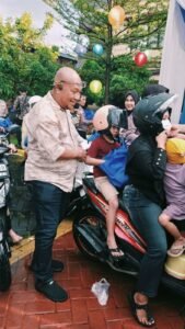 Ketiganya turun langsung ke lapangan, berbaur dengan masyarakat, menyapa para pengendara, sekaligus membagikan helm dan takjil gratis.