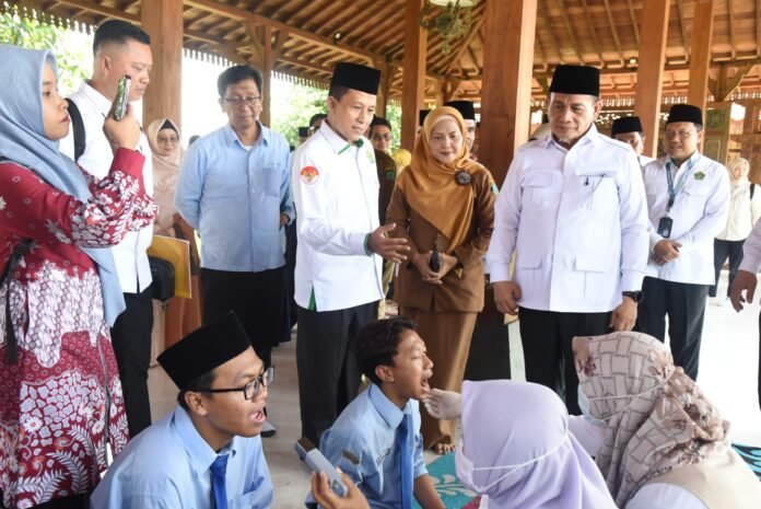 Newsils.com || Sidoarjo – Kick Off program Cek Kesehatan Gratis/CKG bagi siswa sekolah serentak dilakukan seluruh wilayah Indonesia hari ini, Senin, (4/8). Pemkab Sidoarjo melaksanakan program Presiden Prabowo itu di Pondok Pesantren Modern Al-Amanah Junwangi Kecamatan Krian. Terdapat 400 santri putra putri MA Bilingual Al-Amanah yang ikut dalam pemeriksaan kesehatan gratis tersebut. Pemeriksaan kesehatan mulai dari pemeriksaan tinggi badan, berat badan, tekanan darah, gula darah sampai pemeriksaan gigi, mata dan telinga.