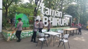 Dengan penuh semangat, personel dari Brimob, TNI dan Polri bahu membahu membersihkan taman,memungut sampah, merapikan tanaman liar, hingga memperbaiki fasilitas maupun yang ada disekitarnya taman yang berkenan belum rapi.