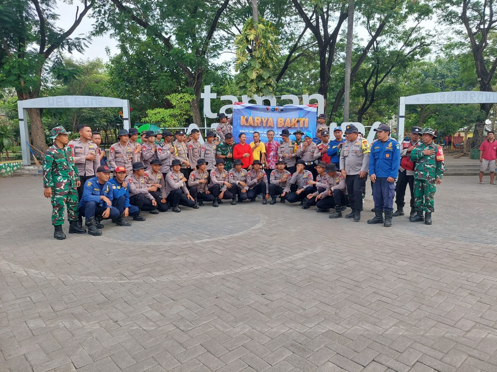 Newsils.com || Krian – Detik detik jelang peringatan HUT Brimob yang ke 80 Korps Brimob Polri , Satuan Brimob bersama Polsek/Koramil Krian melakukan kegiatan Corve/Kerja Bakti bersama bersih bersih Taman Abirupa Krian Kabupaten Sidoarjo, Selasa tanggal 21/10/25.