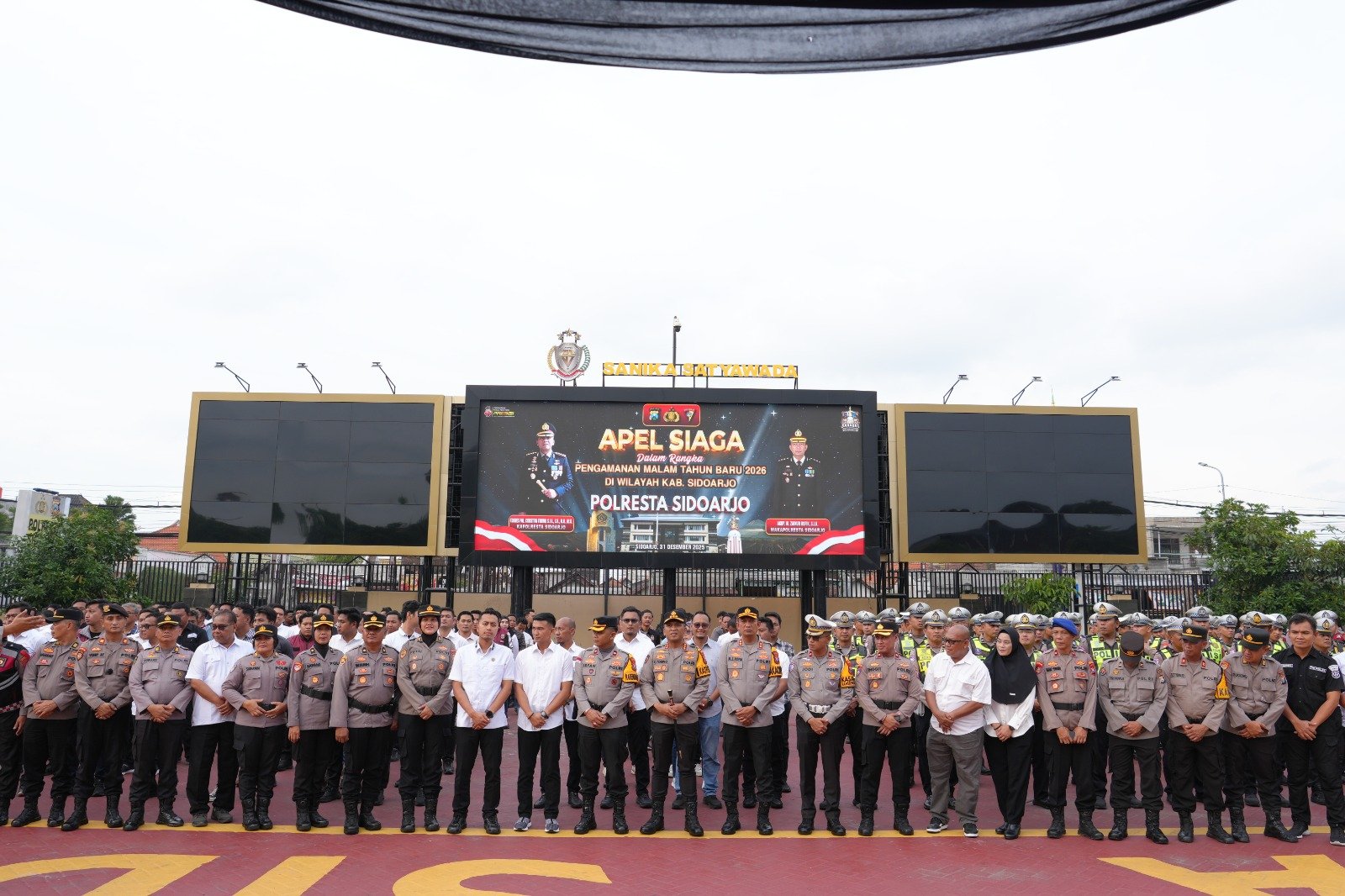 “Mari warga Sidoarjo kita isi malam tahun baru dengan ibadah, berdoa, tidak terlalu bereuforia dan tanpa menyalakan petasan,” ujar Kapolresta Sidoarjo Kombes. Pol. Christian Tobing, usai memimpin apel siaga pengamanan malam tahun baru 2026, Rabu (31/12/2025).