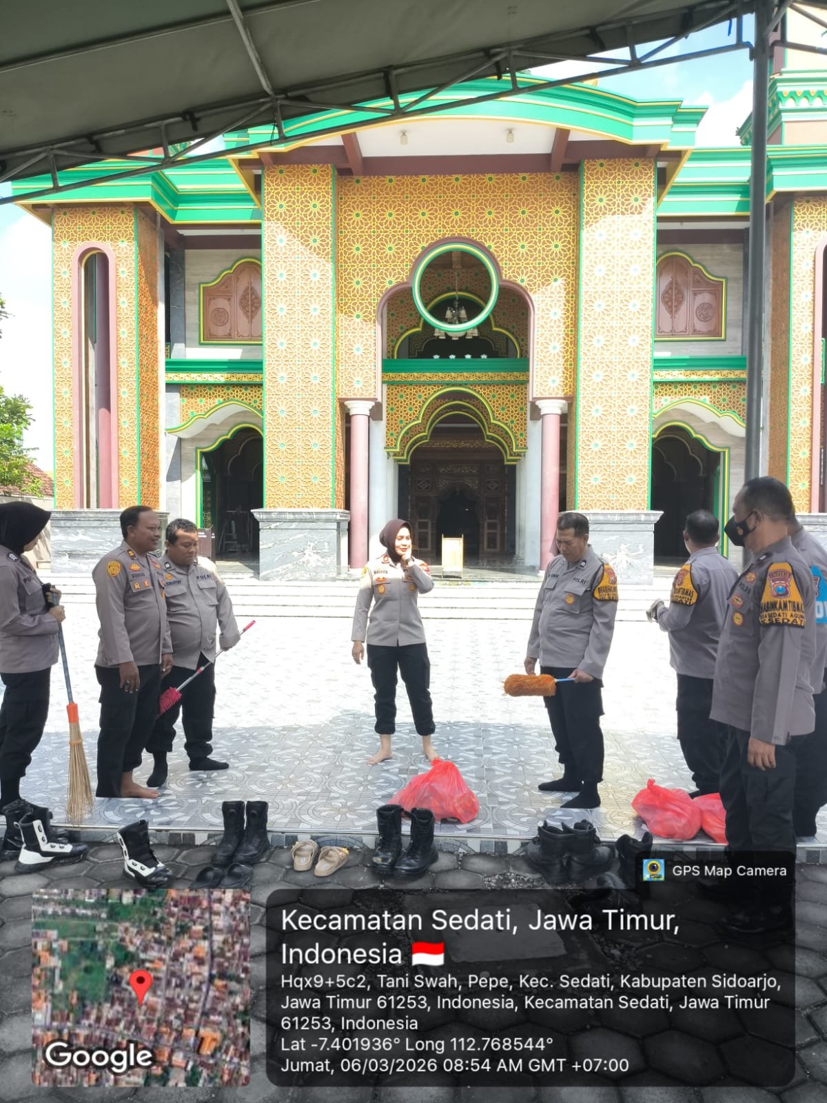 Selain melakukan kerja bakti membersihkan area masjid, Kapolsek Sedati juga menyerahkan secara simbolis paket sembako kepada takmir atau pengurus Masjid Miftahul Abidin sebagai bentuk kepedulian dan bakti sosial kepada masyarakat.