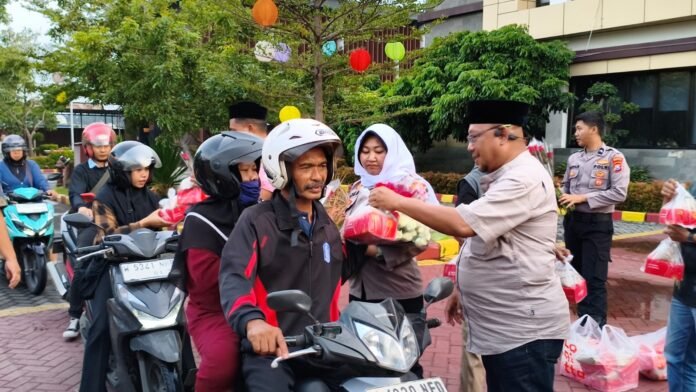 Kegiatan sosial yang digelar di depan Mako Polresta Sidoarjo itu menyasar para pengendara dan warga yang melintas menjelang waktu berbuka puasa.