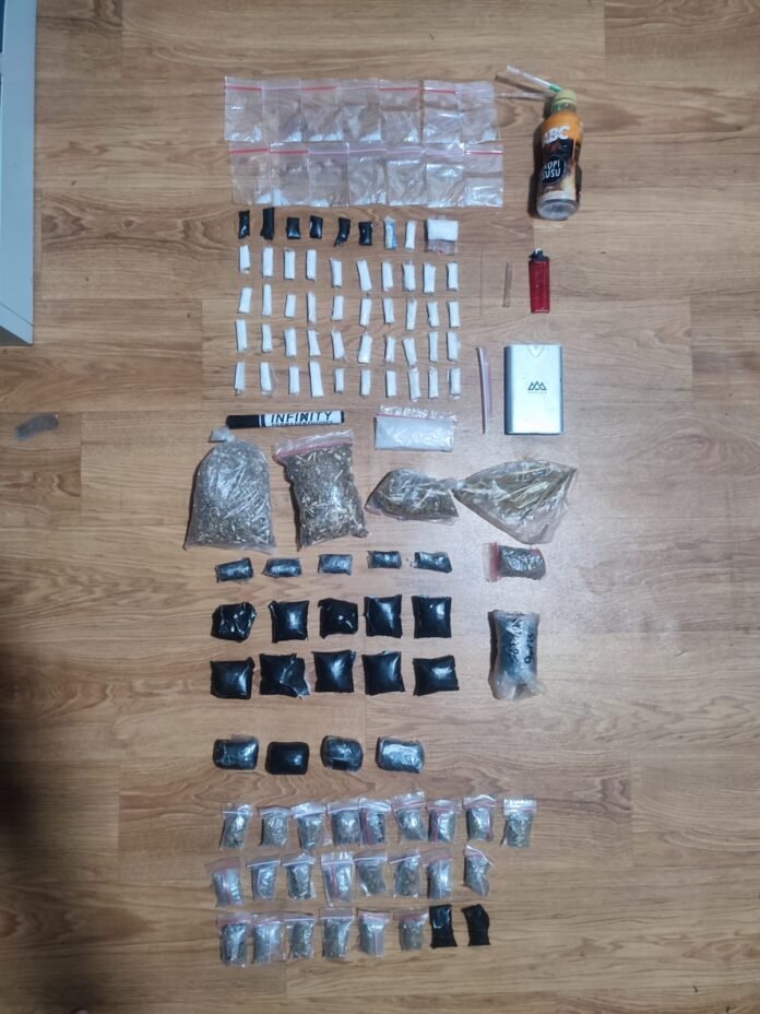 Dari tangan kedua tersangka, Polisi mengamankan sejumlah barang bukti berupa satu alat hisap sabu (AL) beserta pipet, satu timbangan digital, satu pipet kaca, 14 klip sabu, 49 poket sabu, satu klip besar berisi sabu, 45 poket ganja, satu poket besar ganja, tiga plastik besar berisi ganja serta satu plastik berisi batang ganja.