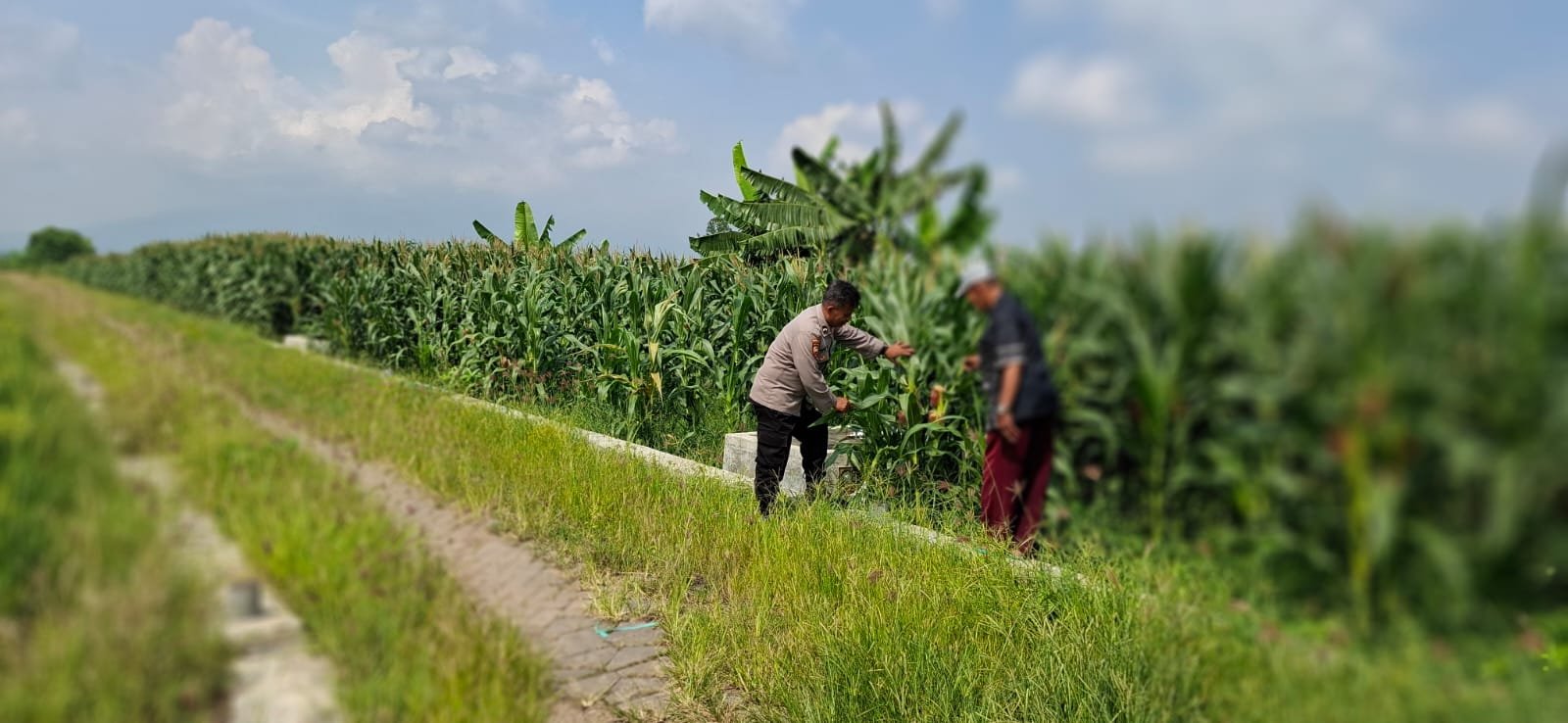 Dalam kegiatan tersebut, Aiptu Puput meninjau langsung kondisi tanaman jagung yang saat ini telah memasuki usia sekitar dua bulan. Ia juga memberikan motivasi kepada petani agar terus melakukan perawatan secara optimal guna mendapatkan hasil panen yang maksimal.