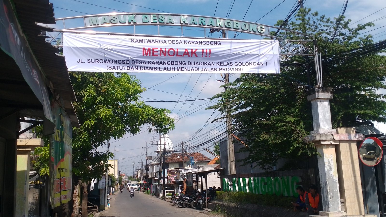 Newsils.com || Gedangan – Rencana peningkatan jalan di Desa Karangbong Kecamatan Gedangan, menjadi jalan klas 1 tingkat provinsi menuai ss penolakan dari warga setempat. Penolakan spanduk protes di sepanjang, jalan utama desa.